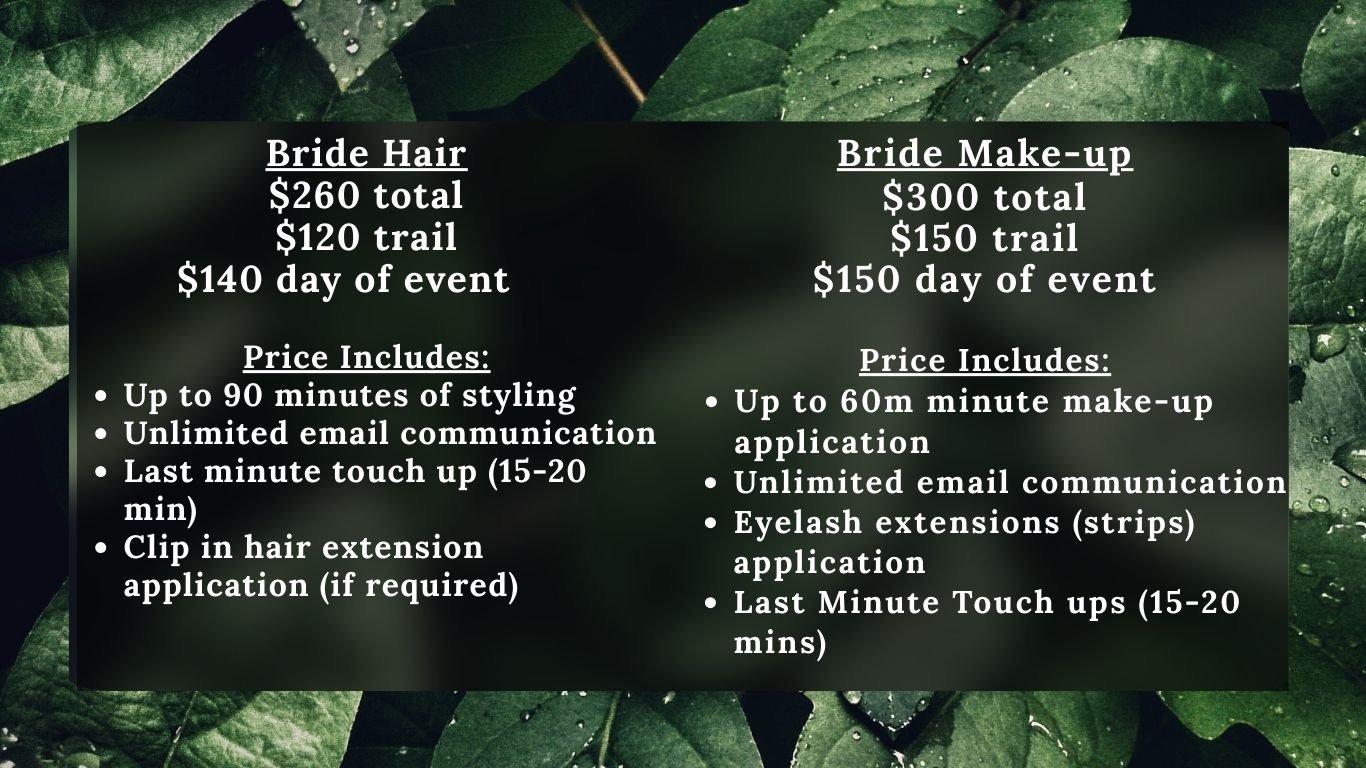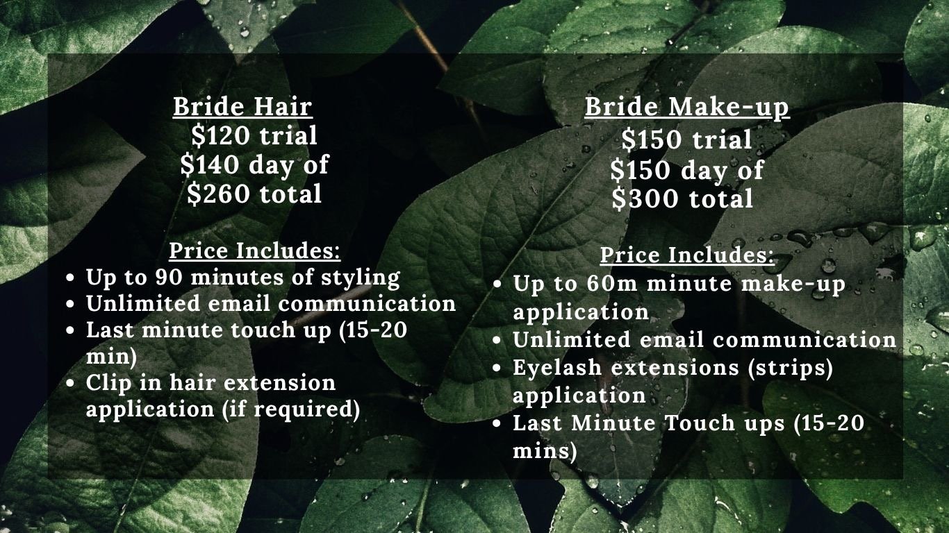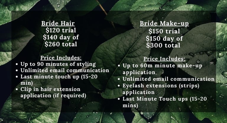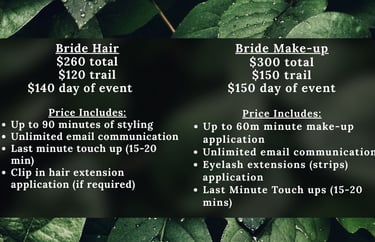 The bridal trial is to talk in depth about the look and style you are going for on the day of. It gives both the stylist and bride a game plan on how long the style will take and gives them an opportunity to talk about anything the bride might like done differently or anything that may need adjustments. Bridal trial is recommended to help your day run smoother, and to make sure we meet your expectations.